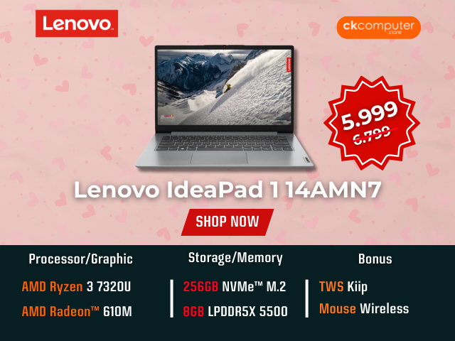 Lenovo Ideapad 1 14AMN7-82VF003HID Color : Cloud Grey Processor : AMD Ryzen™ 3 7320U (4 cores / 8 threads, 2.4 GHz base up to 4.1 GHz) AI PC Category : – NPU : – Special feature : – Display : 14″ Full HD (1920×1080) Anti-glare (220 nits) Memory : 8 GB LPDDR5-5500 (soldered, not upgradable)… selengkapnya