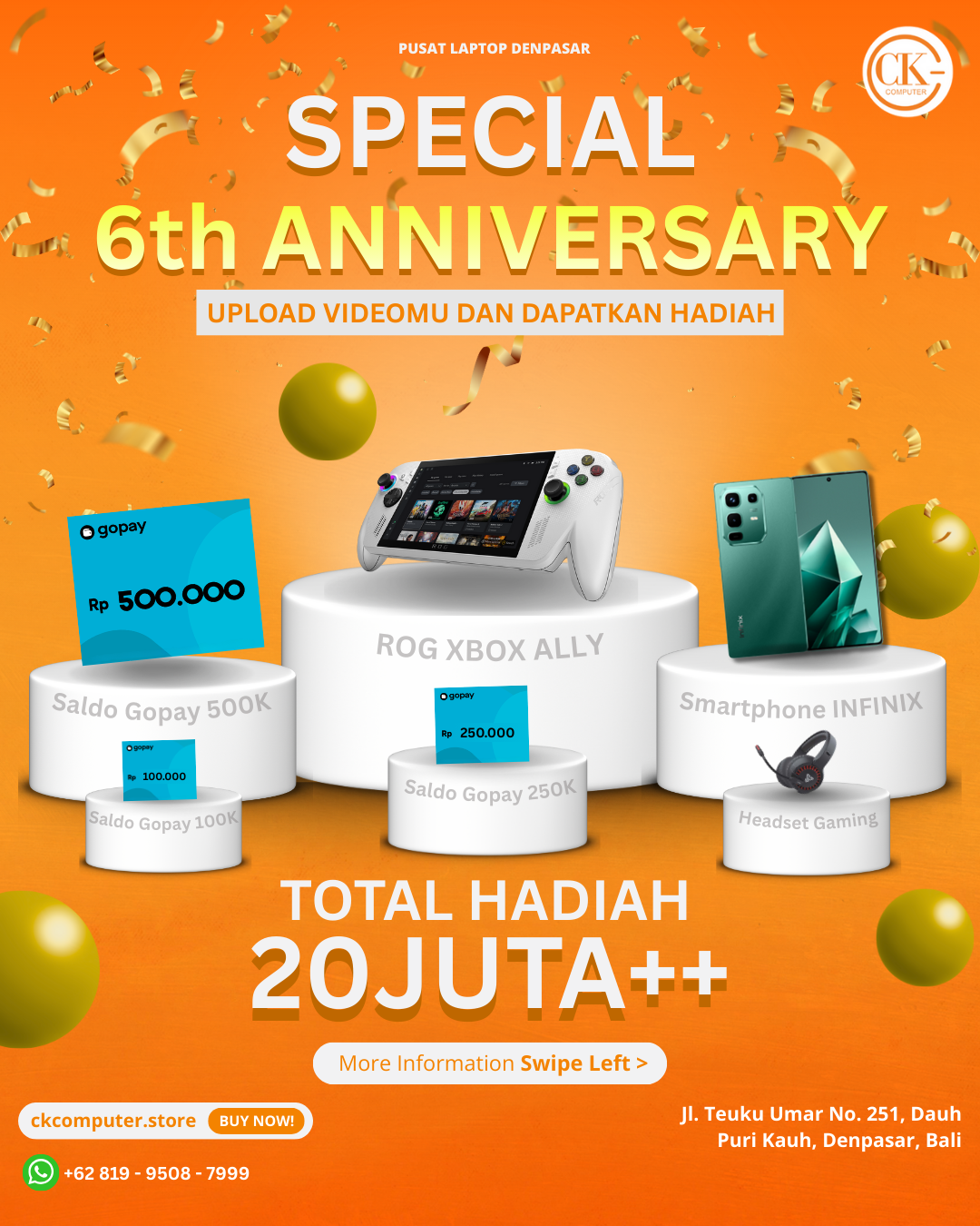 Nggak kerasa, CK Computer resmi memasuki usia ke-6! Enam tahun perjalanan penuh cerita, upgrade, dan kepercayaan dari pelanggan setia. Untuk merayakan momen spesial ini, CK Computer mengadakan Giveaway Anniversary dengan total hadiah mencapai 20 juta rupiah. Ini bukan sekadar perayaan, tapi bentuk apresiasi kami untuk kamu yang selalu support dan tumbuh bareng CK Computer.
