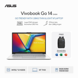 *Harga Hubungi CSAsus Vivobook Go 14 E1404GA-FHD353M Intel Core I3 N305 Processor : Intel® Core™ i3-N305 Processor 1.8 GHz (6MB Cache, up to 3.8 GHz, 8 cores, 8 Threads) Display : 14.0-inch FHD (1920 x 1080) 16:9 aspect ratio LED Backlit 60Hz refresh rate 250nits 45% NTSC color gamut Anti-glare display 83 % Memory : 8GB DDR4… selengkapnya